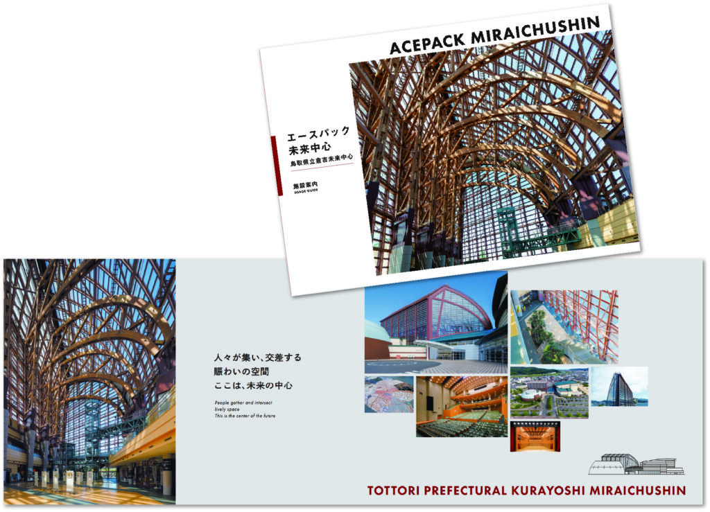 施設利用者に向けたパンフレット。写真を多く使用したページ構成で各部屋を紹介。建物に入ると目に飛び込んでくる高さ42mの木造空間アトリウムなど、コンパクトな冊子ながらも、館内の特徴を魅力的に発信している。